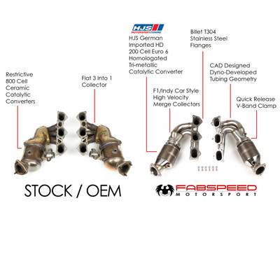 Fabspeed HJS German tri-metallic catalytic converters are State of the Art ultimate emission legal performance enhancing components. Your sports car , SUV and Truck equipped with HJS German catalytic converters is 100% Guaranteed to make more Horsepower, Torque, enhanced sports car, better fuel economy than any OEM stock catalytic converter and or ANY Illegal Cat Bypass pipe downtube. In fact, if you have any older cars, used cars and or cars with FAILING, DELETED or Butchered catalytic converters then do yourself a favor and UPGRADE your car with a set of FAbspeed HJS German high-flow trimetallic OBD2 European Certified Homologated catalytic converters. Its the Right thing to do to achieve CLEAN and GREEN Performance and leave absolutely nothing on the table for performance and sports car sound. Furthermore all the Air we breathe globally is not affected by using cat-bypass pipes or stupid solutions like NOn Catted downtubes.