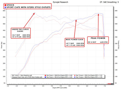 After extensive dyno development, peak power of 585 WHP was obtained at 6600 RPM, compared to the stock peak wheel power of 569 WHP. Max power gains of +54.9 WHP (65.88 crank HP) came at 5500 RPM and +58.9 ft/lbs TQ at 5350 RPM. With faster turbo spooling we saw impressive under the curve gains of +34.8 HP/ +29 whp (whp = horsepower at the wheels) at 3000 RPM and +51.4 ft/lbs TQ. See our dyno graph above for more details. These are MASSIVE emissions complaint NO Check engine light gains with superb sports car sound.