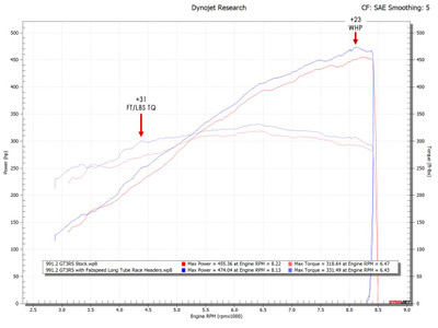 We developed our headers to make power with and without an ECU Tune. While the hardware made significant gains alone, we found its full power potential was realized when combined with our proprietary tune. As tested on a GT3 RS, our Long Tube Competition Race Header System with ECU Tune adds 38 whp and 26 ft/lbs of torque at 7650 RPM. Further down the rev range, our Header System gives you major mid range grunt: 24 whp and 28 ft/lbs of torque at 4500 RPM. Without the ECU Tune, you can expect solid gains of 24 whp and 16 ft/lbs at 7650 RPM and 23 whp and 26 ft/lbs at 4500 RPM. Any 991 GT3 becomes an absolute unleashed tiger with our Fabspeed Motorsport competition header system.